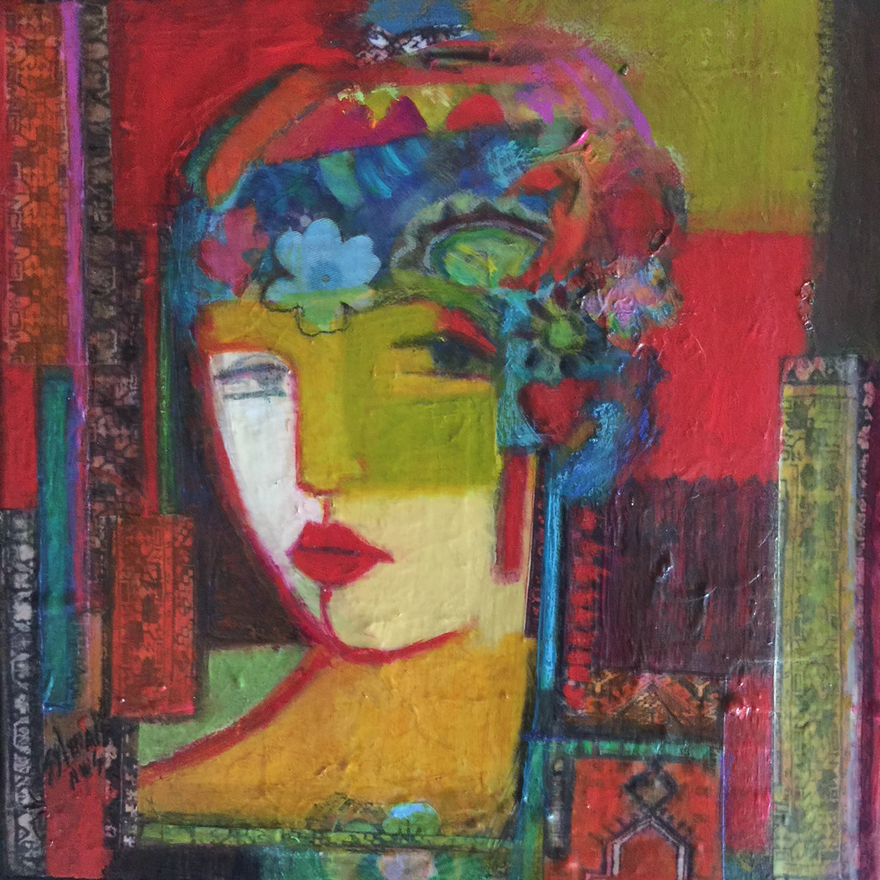 A vibrant celebration of texture, color, and cultural motif, "Secret Patterns" by Sylvia Megerdichian merges expressive brushwork with intricate collage techniques. Bright multi-colored design with a bold contrast of a color block and patterned background, creating a rich tapestry that bridges fine art and folk craft.
