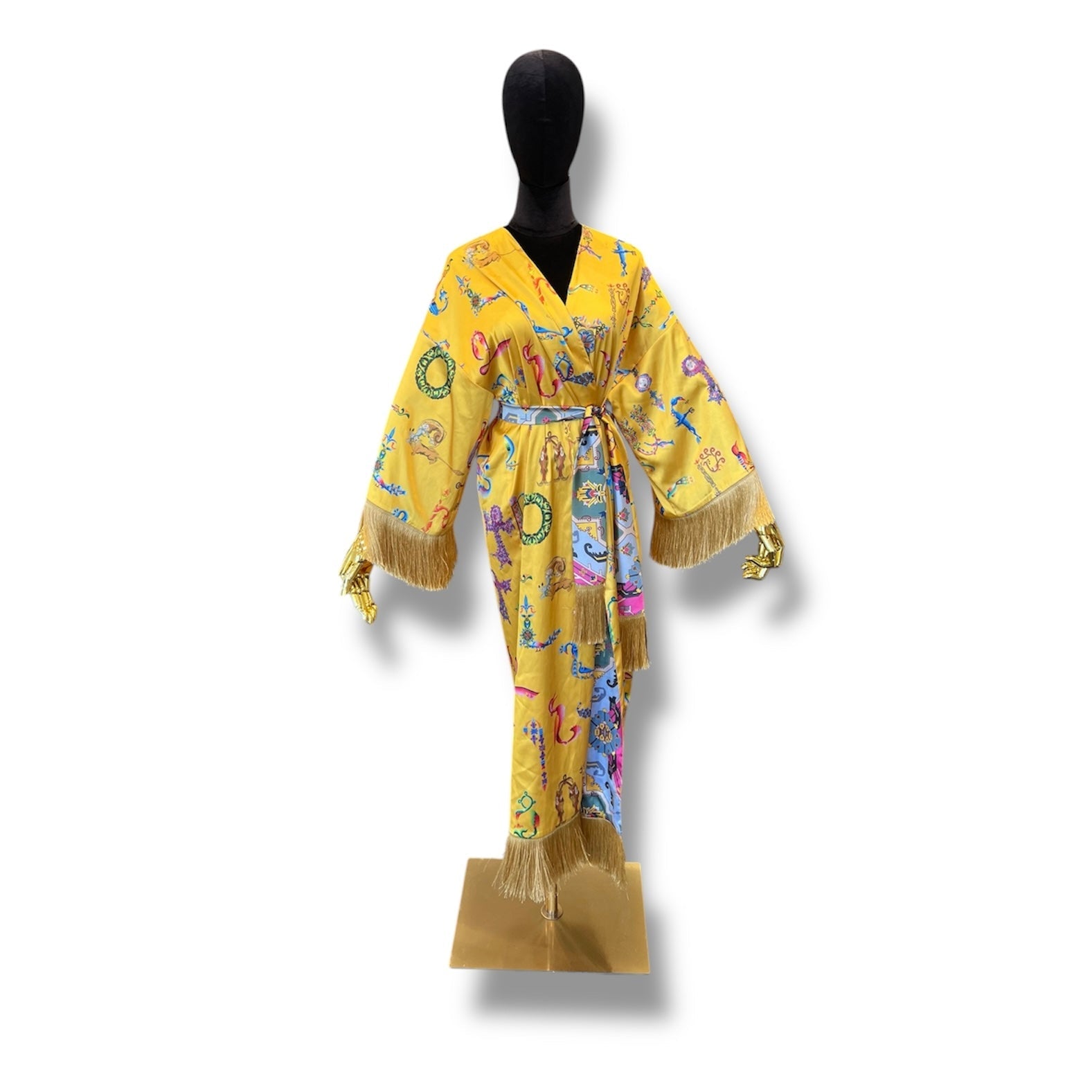Step into vibrant elegance with this bold Armenian-designed reversible wrap coat or robe, where culture meets contemporary fashion. Adorned with vivid colors and intricate patterns inspired by Armenian heritage such as the classic rug and Armenian alphabet creating reversible outerwear, this versatile piece effortlessly transitions from chic outerwear to luxurious loungewear. The sweeping fringe details add a touch of sophistication, making it a true statement piece. Whether styled outdoors for a standout look or indoors for a cozy, fashionable retreat, this robe embodies timeless artistry and modern versatility, perfect for those who appreciate fashion with cultural significance.